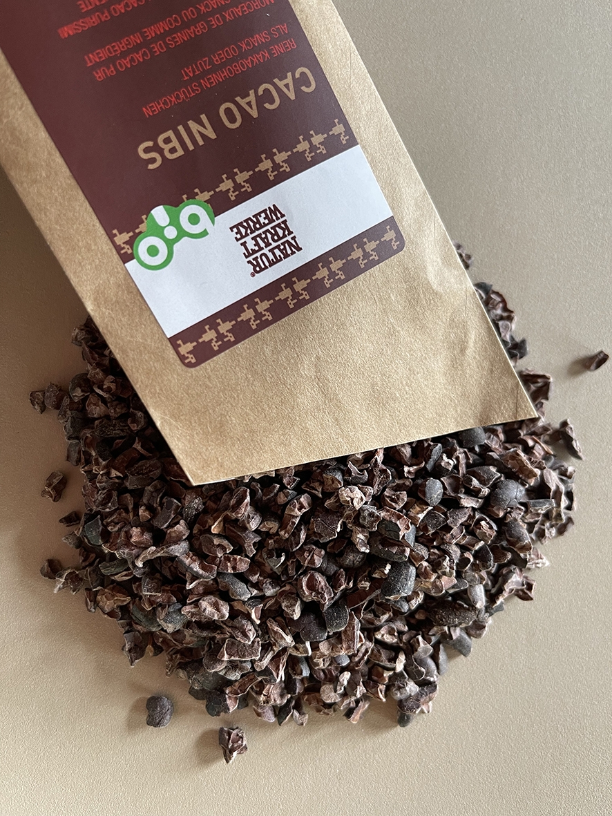 Was mach ich damit: Pur als idealen Snack knabbern, ins Müsli geben oder in Backmischungen aller Art, Crèmes, Desserts usw. Sehr lecker auch in Kombination mit Trockenfrüchten. Die fettarme, zucker- und milchfreie Alternative zu Schokolade für Schokolade-Liebhaber:innen und alle, die ihre Extraportion Glück und Energie brauchen.
