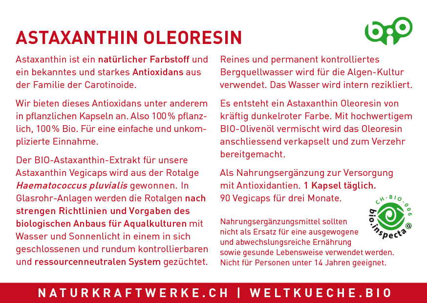 Nach der Ernte und Trocknung der Algen erfolgt die Extraktion des wertvollen Antioxidans Astaxanthin aus der Biomasse. Das Resultat ist ein reines, öliges Astaxanthin Oleoresin von wunderschön kräftig dunkelroter Farbe. Mit hochwertigem BIO-Olivenöl vermischt wird das Oleoresin anschliessend verkapselt und zum Verzehr bereitgemacht.