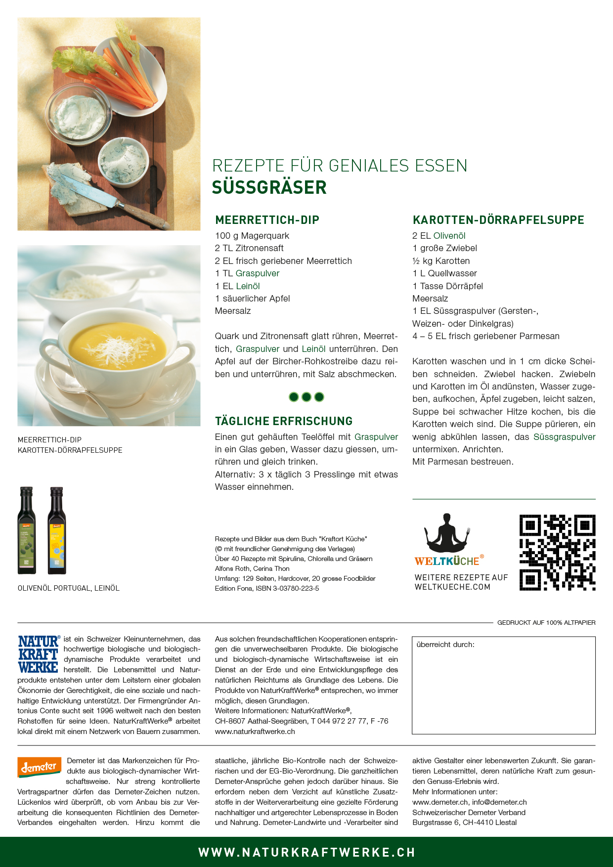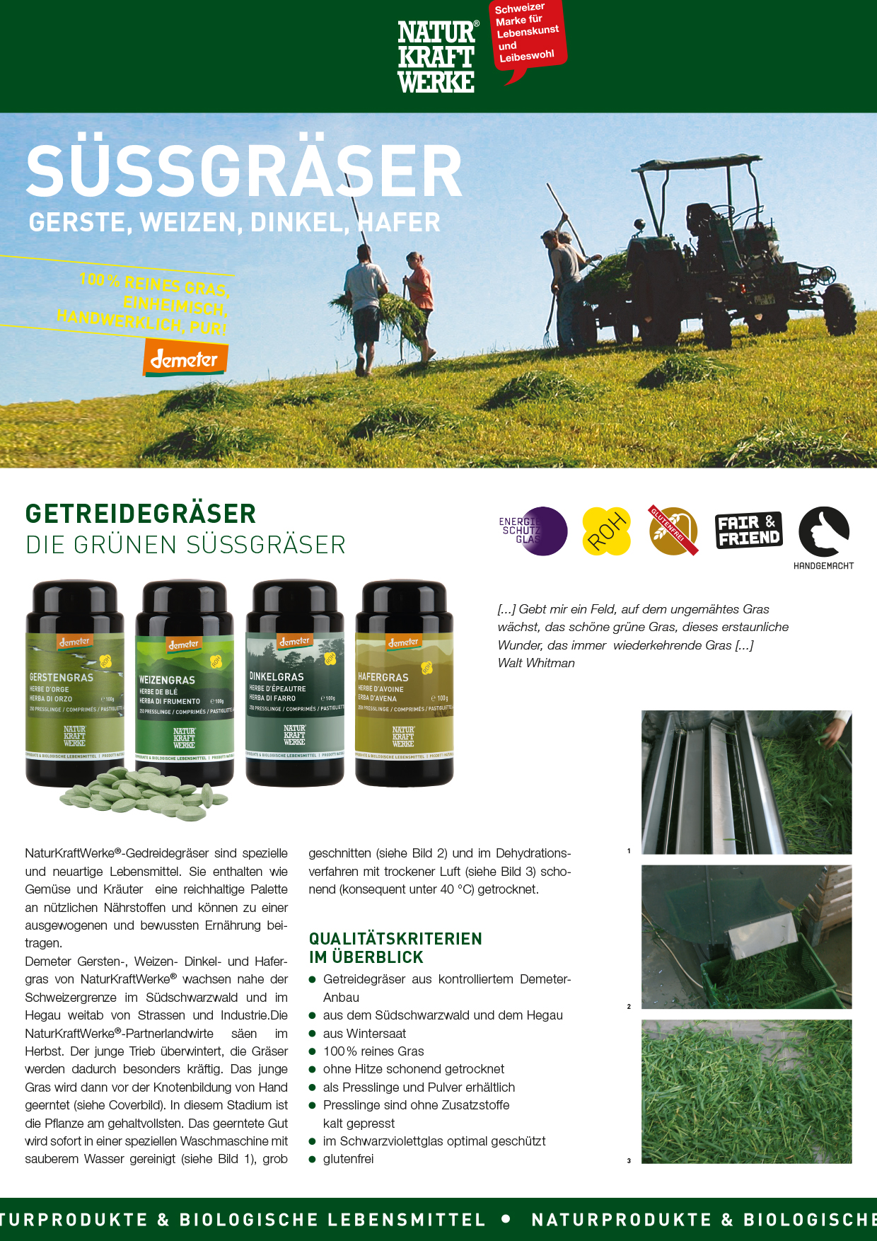 Bei unseren Süssgräsern handelt es sich um die noch jungen, vitalen und chlorophyllreichen Blätter der Gersten-, Weizen-, Dinkel- oder Haferpflanzen. Die grünen Blätter enthalten wie grünes Gemüse und Kräuter eine reichhaltige Palette an Pflanzenstoffen und können zu einer ausgewogenen und bewussten Ernährung beitragen. Die Nähr- und Vitalstoffe sind wie in Obst und Gemüse natürlich gebunden, was eine besonders gute Verwertbarkeit gewährleistet.