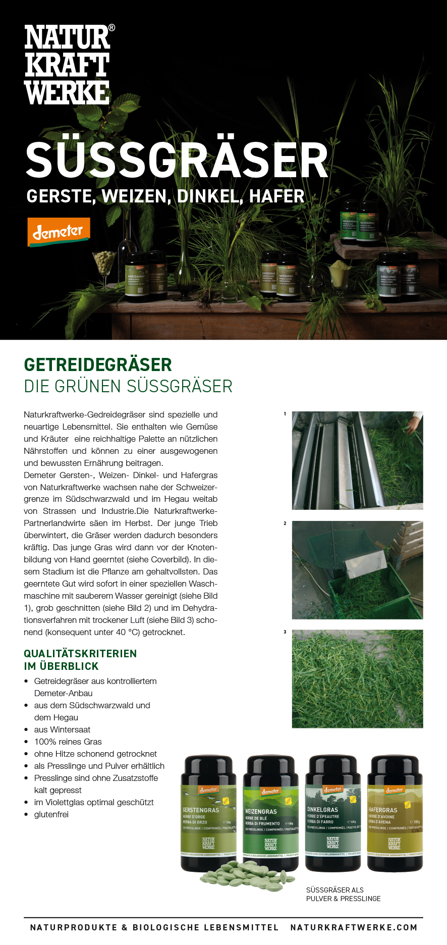 Bei unseren Süssgräsern handelt es sich um die noch jungen, vitalen und chlorophyllreichen Blätter der Gersten-, Weizen-, Dinkel- oder Haferpflanzen. Die grünen Blätter enthalten wie grünes Gemüse und Kräuter eine reichhaltige Palette an Pflanzenstoffen und können zu einer ausgewogenen und bewussten Ernährung beitragen. Die Nähr- und Vitalstoffe sind wie in Obst und Gemüse natürlich gebunden, was eine besonders gute Verwertbarkeit gewährleistet.