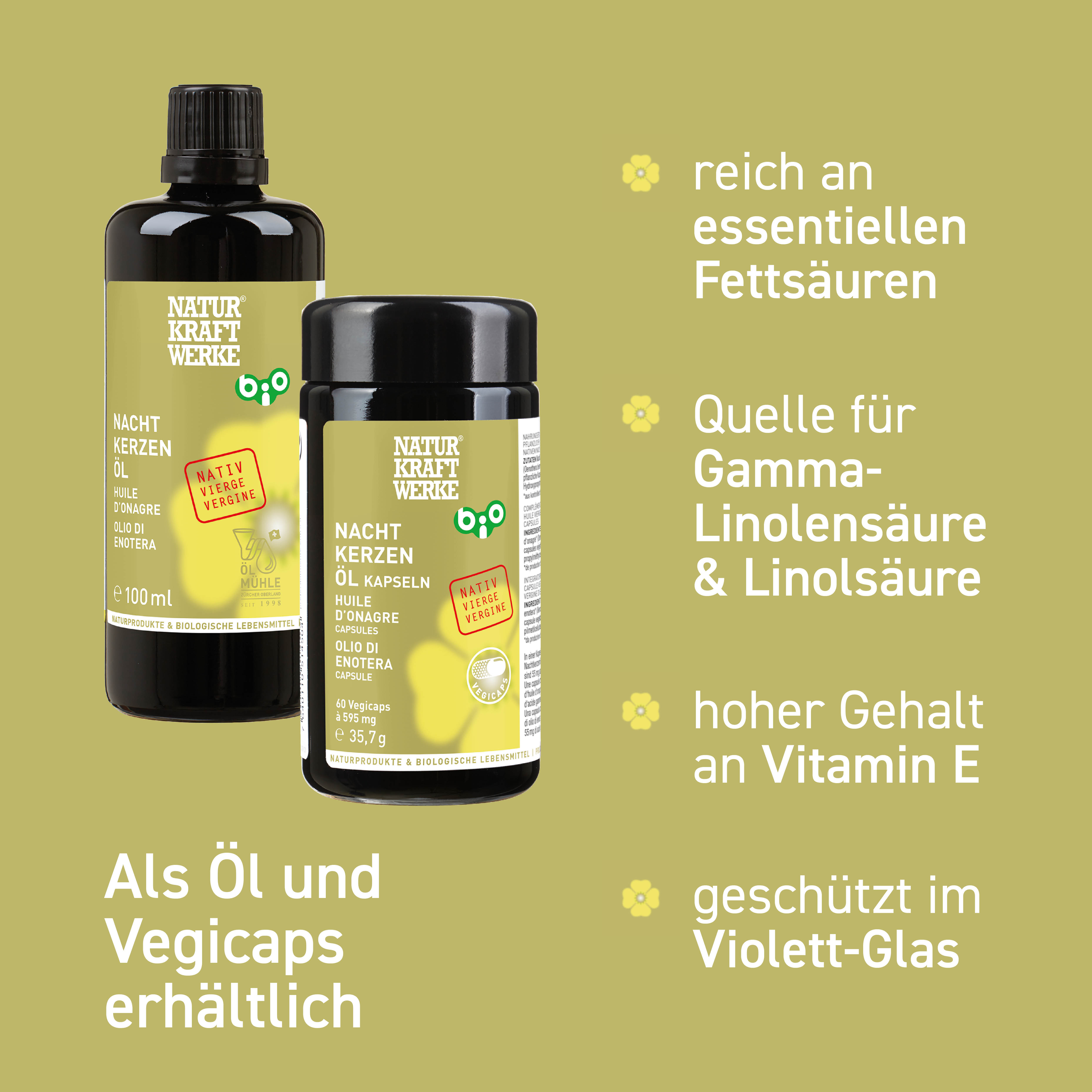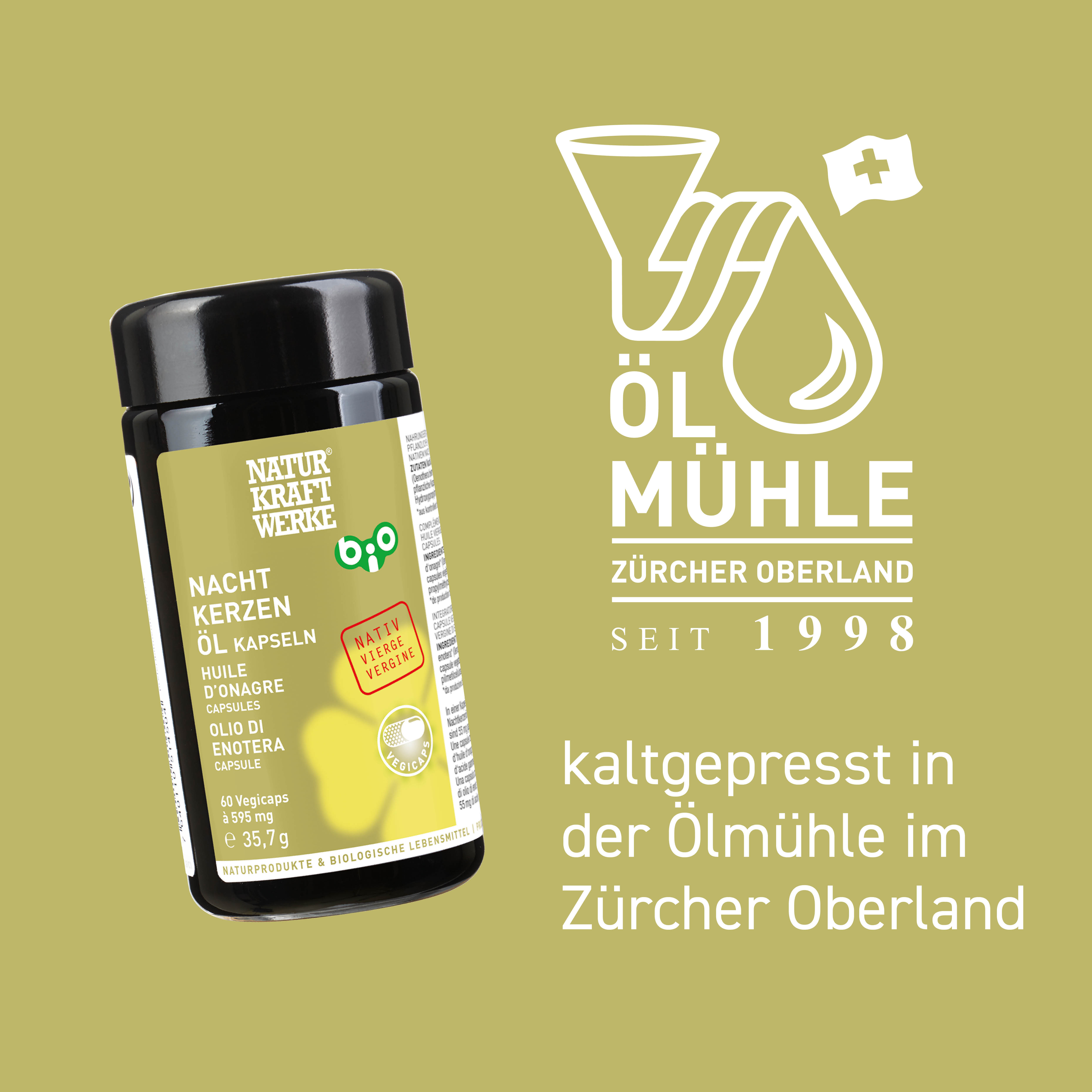 Die hellgelb leuchtenden Blüten duften zahlreich und lieblich in die Abenddämmerung hinein. Die Oenothera biennis wächst gerne auch wild, zum Beispiel auf Brachen. Sie leistet dort einen schönen Beitrag für Nachtschwärmer*innen. In der Schweiz gibt es über 3400 Arten von solchen Nachtfaltern. Eine Kultivierung von Nachtkerzen ist eher einfach, da sie wenig Ansprüche an Standort und Boden hat. Die Ernte der vielen Samen, die Reinigung und die Aufbereitung haben es aber in sich. Die Nachtkerze bildet kleine Kapselfrüchte mit unzähligen, sehr kleinen und dunkelbraunen Samen aus, in denen das wertvolle Öl versteckt ist. Nach der Ernte werden die Samen dehydriert, gereinigt und kontrolliert. Das Öl wird durch schonende Kaltpressung gewonnen und anschliessend verkapselt.