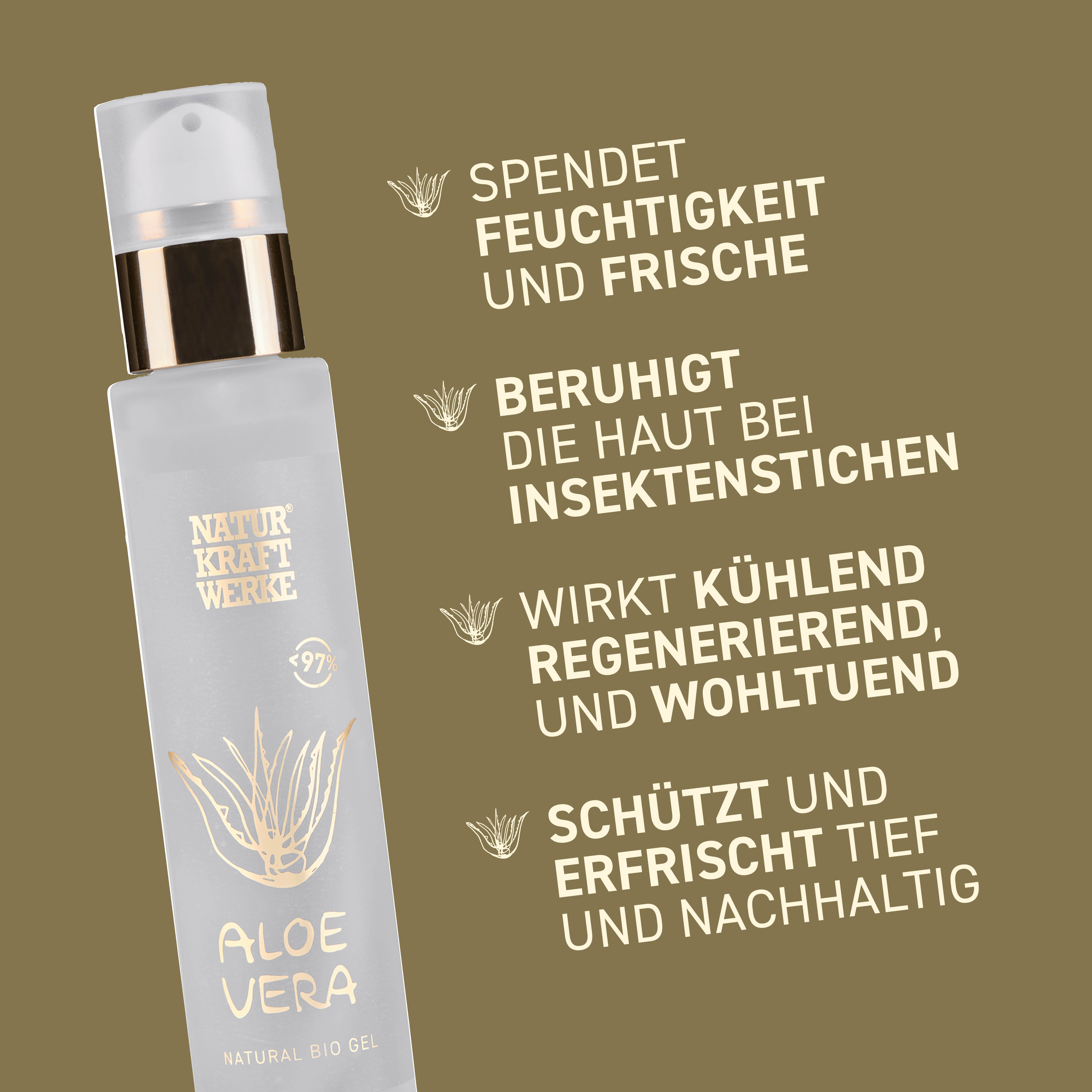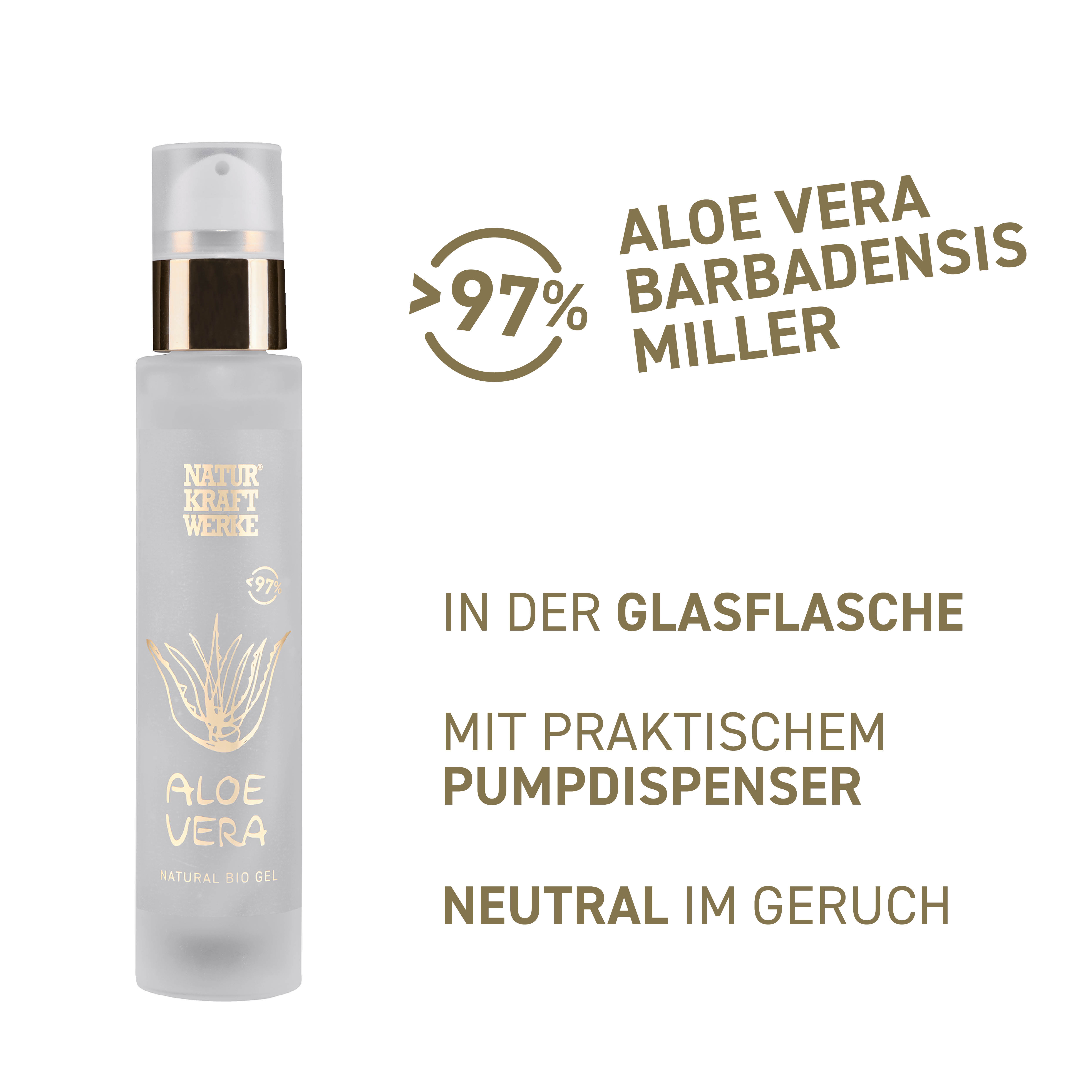 Die Idee dieses Gels war, einen möglichst reinen biologischem Aloe Vera Gel als Spray zu entwickeln. Mit so vielen stabilisierenden Konservierungsstoffen wie nötig aber gleichzeitig mit so wenig wie möglich. Das haben wir mit Hilfe einer schweizerischen Kosmetikproduzentin mit viel Expertise, die den Spray auch für uns herstellt, geschafft. Entstanden ist dieser praktische NaturKraftWerke Aloe Vera Spray. 100 % Bio-Kosmetik. 97 % Bio-Aloesaft. In der Glas-Flasche.