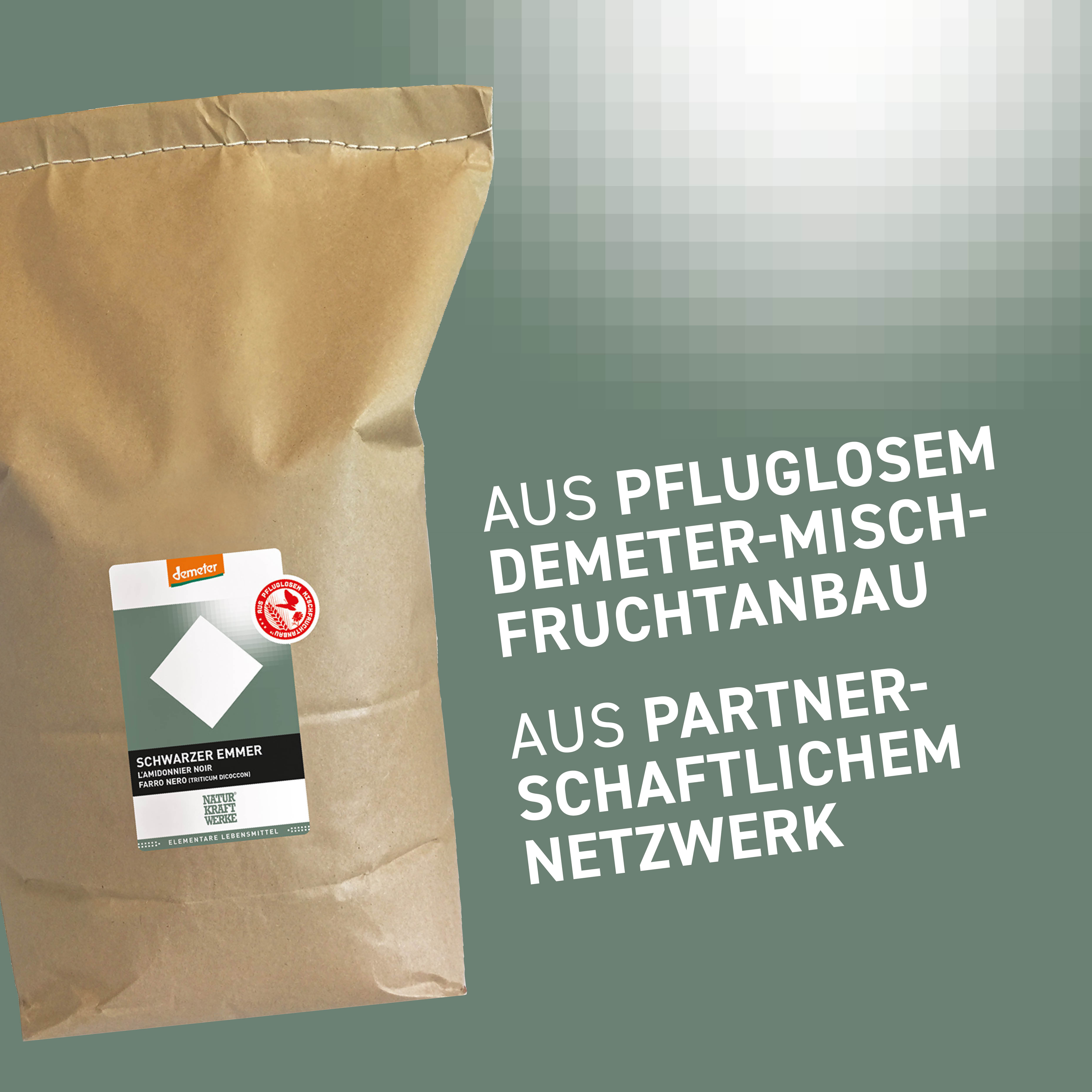 Emmer gilt als Rückgrat der ägyptischen Zivilisation. Aus ihm entstand das erste Brot und Bier. Der winterharte Schwarze Emmer ist vor UV-bedingten Mutationen geschützt und genetisch das beständigste Getreide. Seine gewöhnungsbedürftigen Backeigenschaften belohnt er mit feinem Geschmack und hohem ernährungsphysiologischem Wert. Der Schwarze Emmer von Naturkraftwerke ist auch keimfähig.