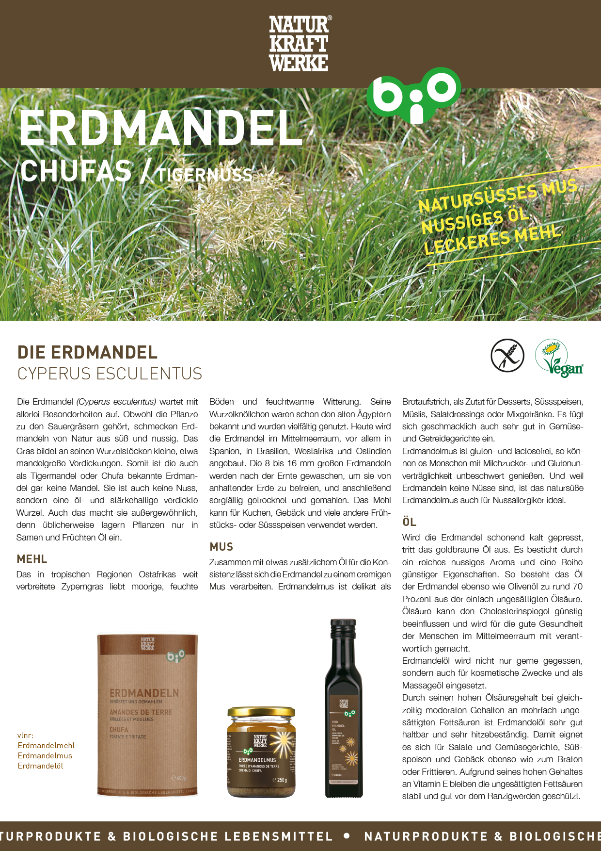 Die Erdmandel (Cyperus esculentus) wartet mit allerlei Besonderheiten auf. Obwohl die Pflanze zu den Sauergräsern gehört, schmecken Erdmandeln von Natur aus süss und nussig. Erdmandelmus ist reich an verdauungsfördernden Ballaststoffen, Mineralien und Vitamin E. Da es gluten- und lactosefrei ist, können es Menschen mit Milchzucker- und Glutenunverträglichkeit unbeschwert genießen. Und weil Erdmandeln keine Nüsse sind, ist das natursüße Erdmandelmus auch für Nussallergiker ideal.