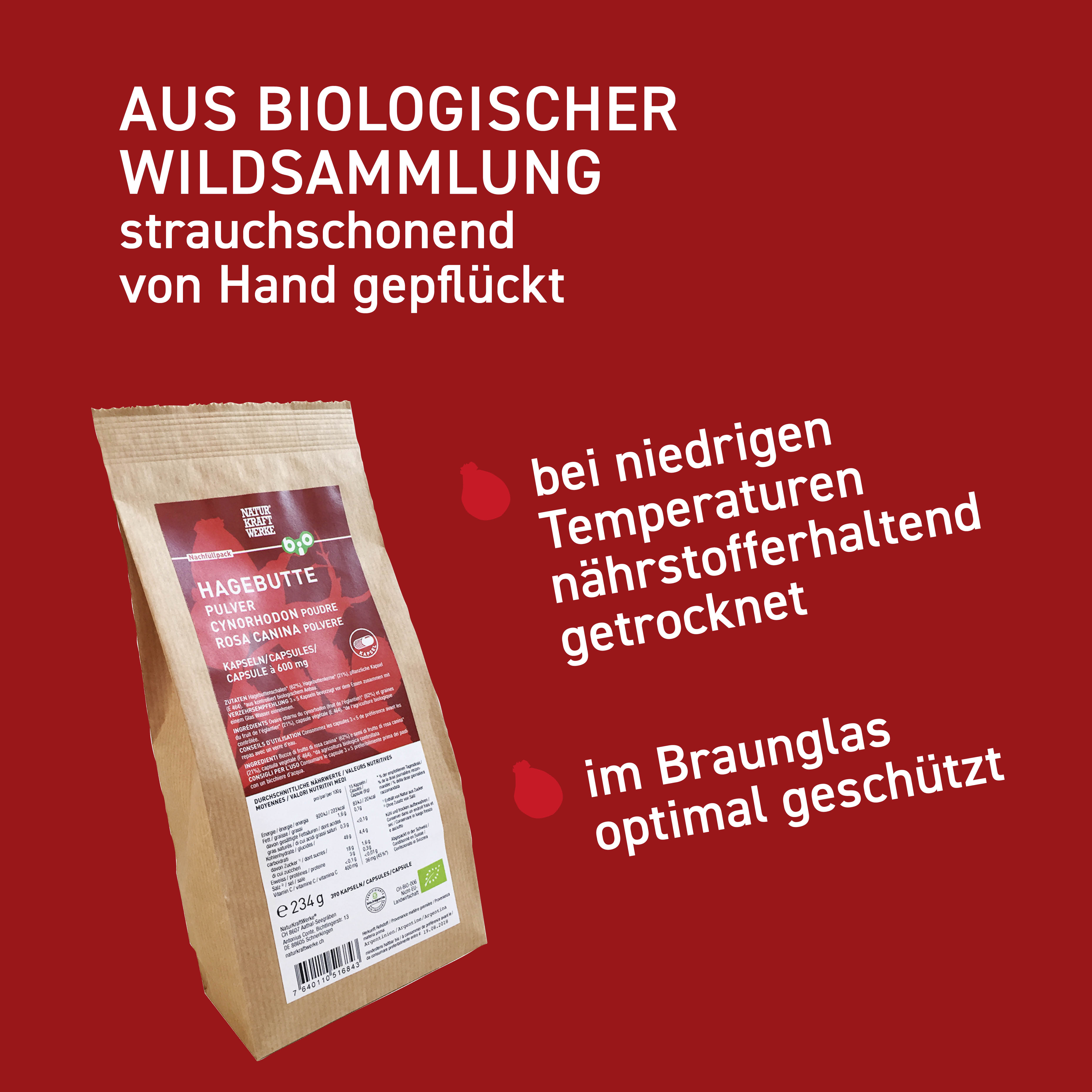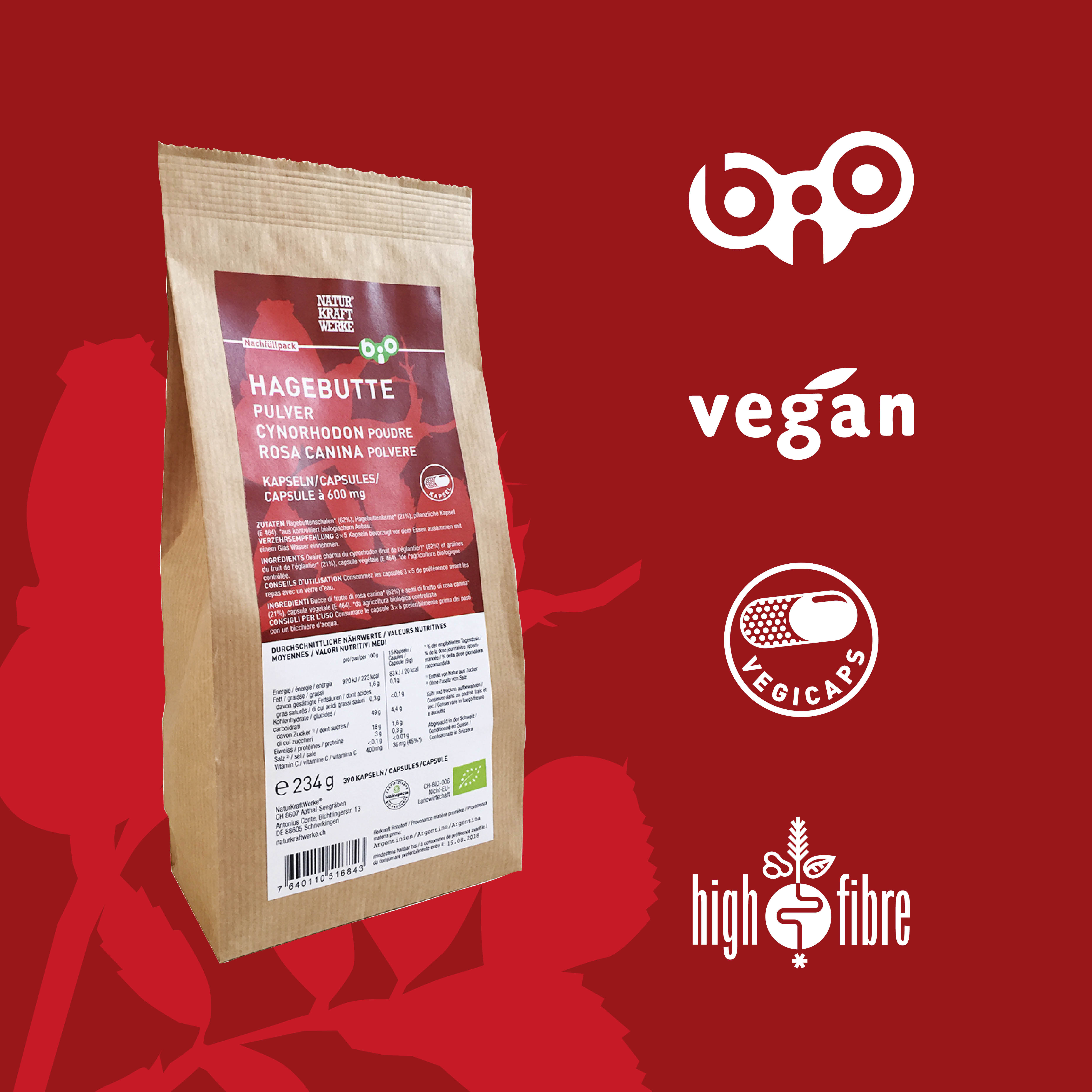 - 100 % Rosa canina Fruchtpulver in pflanzlichen Cellullosekapseln