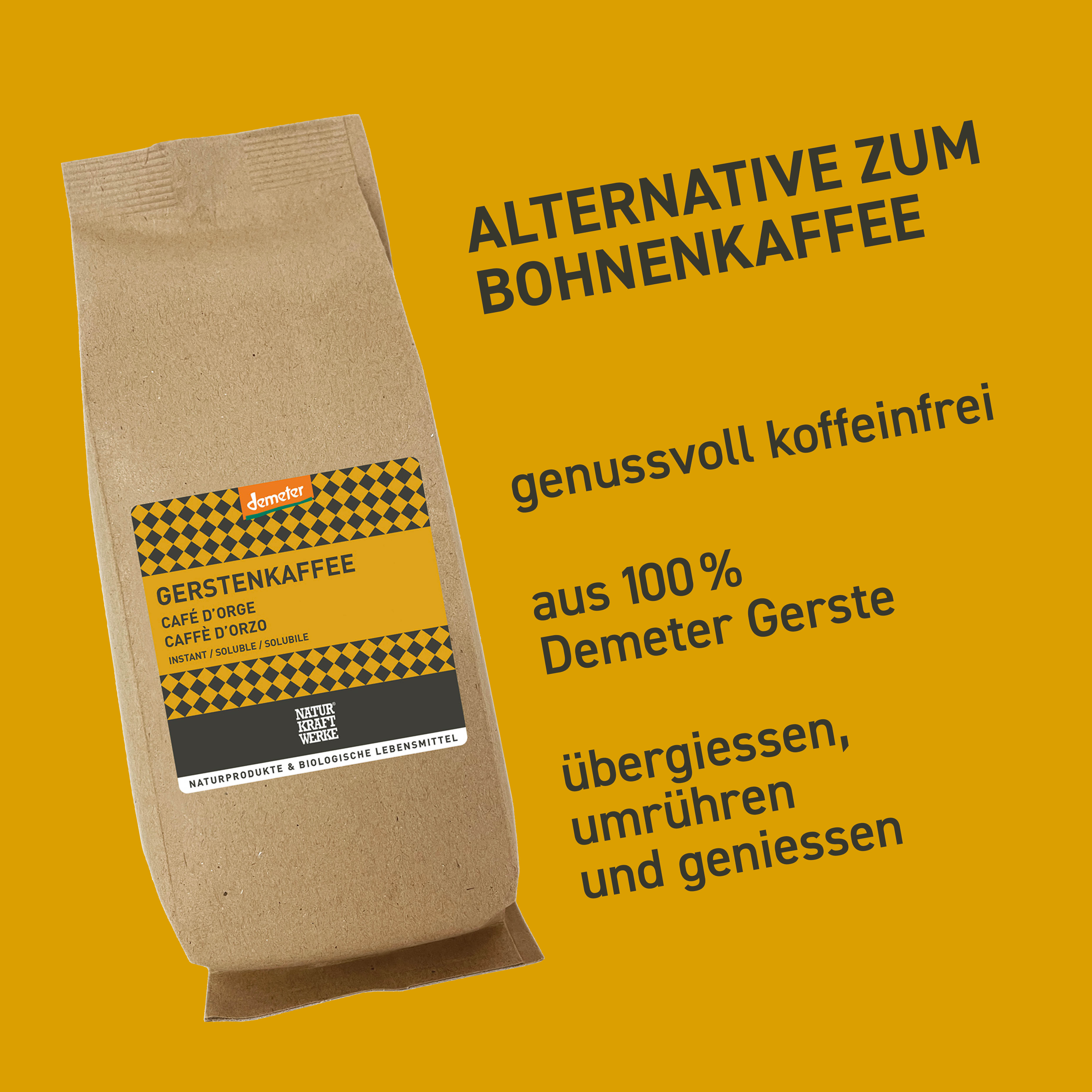 Unser Demeter Gerstenkaffee ist ein koffeinfreies Getränk mit kräftig rundem Aroma. Der Kaffee ist schnell und einfach zubereitet und schmeckt vollmundig getreidig. Für alle, die mal etwas anderes als Bohnenkaffee und doch das Gefühl von Kaffeetrinken wünschen.Schmeckt auch sehr fein direkt mit Milch oder Pflanzendrink aufgebrüht. Ganz ohne Wasser.
