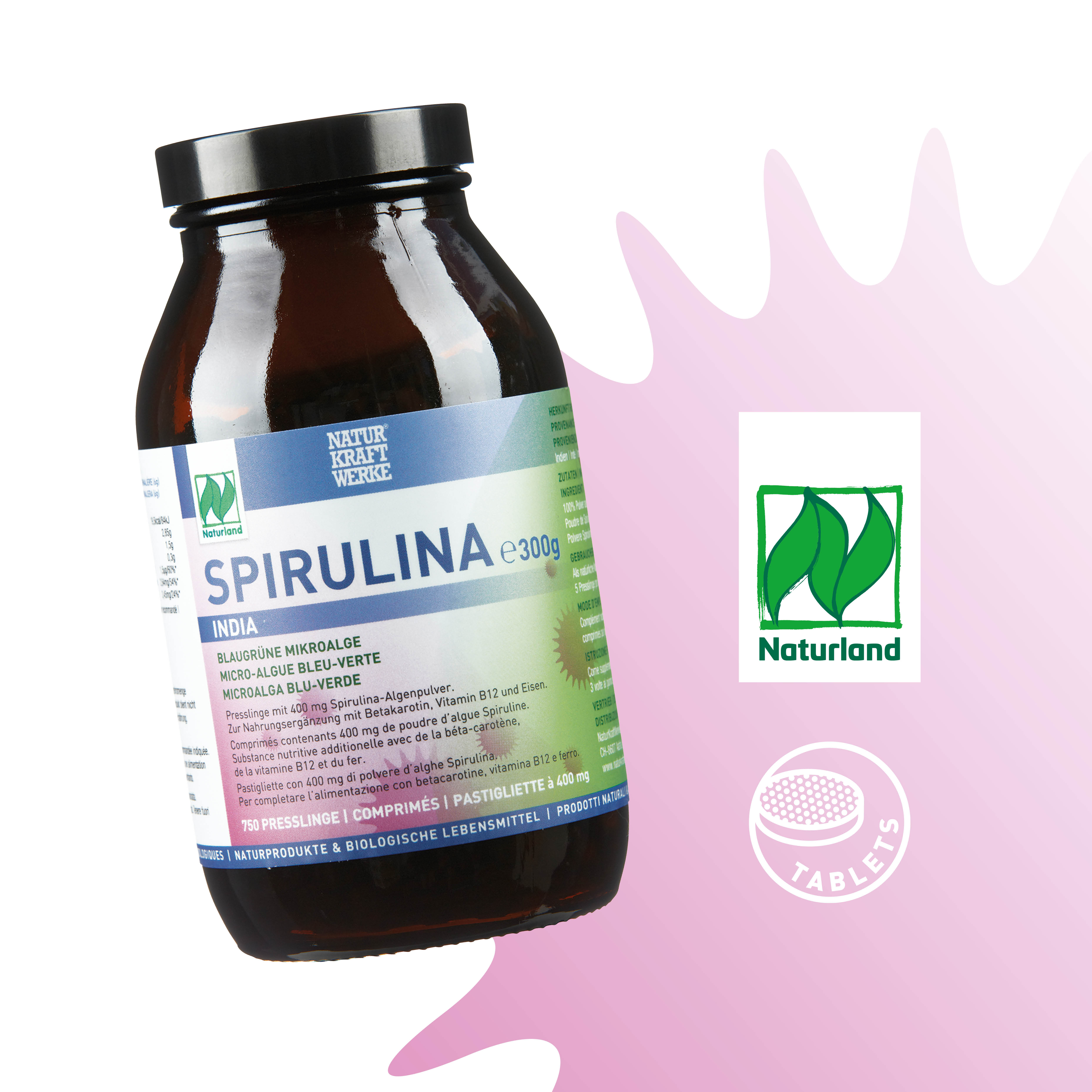 Spirulina aus Bio-Anbau, Naturland zertifiziert, mit organischen u. pflanzlichen Nährlösungen insbesondere Stickstoff und Phosphor, 100% reines Spirulina platensis, schonend getrocknet, als Presslinge erhältlich im braunen Lichtschutzglas und im praktischen Nachfüllbeutel. Spirulina hat sich bewährt als rein pflanzlicher Spender von pflanzlichem Vitamin B12, natürlichem Betakarotin und zweiwertigem Eisen.