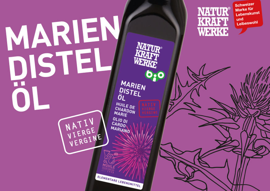 Das Mariendistelöl von Naturkraftwerke wird in der hauseigenen Ölmühle Zürcher Oberland immer frisch in kleinen Chargen aus besten Rohstoffen kaltgepresst. Die Inhaltsstoffe werden durch dieses Verfahren bestmöglich geschützt. Nach der Kaltpressung wird das Öl in violette Lichtschutzflaschen abgefüllt.