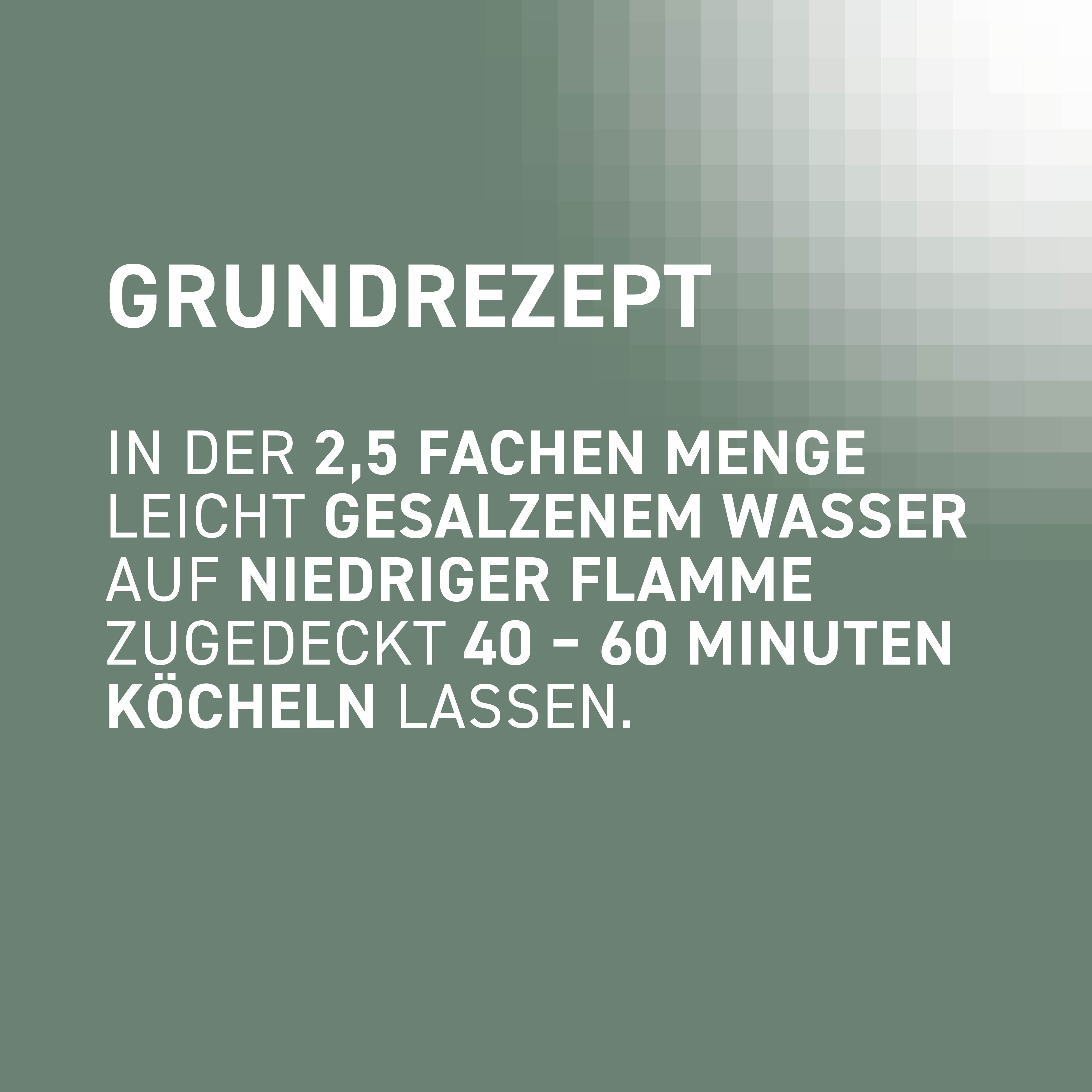 Grundrezept: in der 2,5 fachen Menge leicht gesalzenem Wasser auf niedriger Flamme zugedeckt 40 – 60 Minuten köcheln lassen.