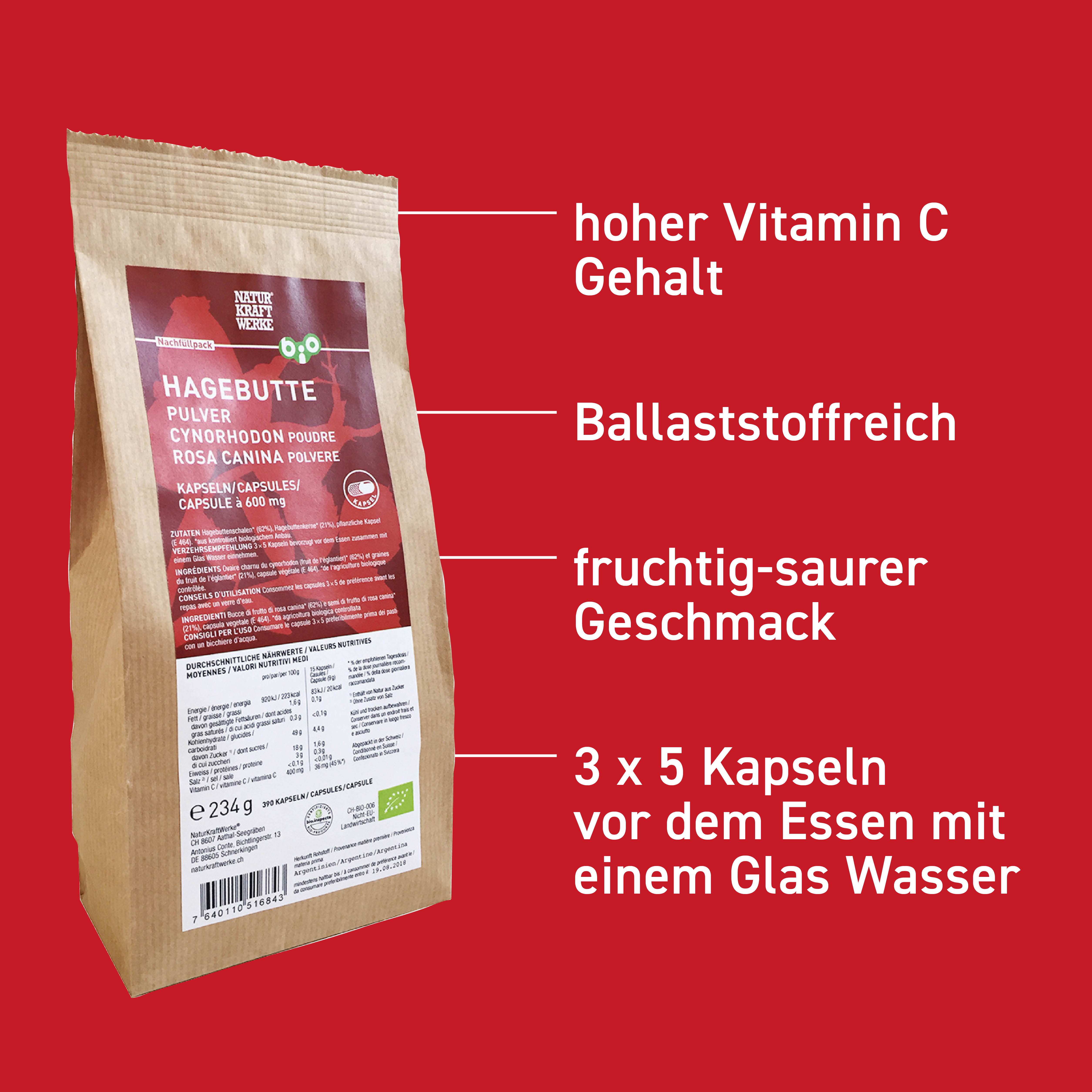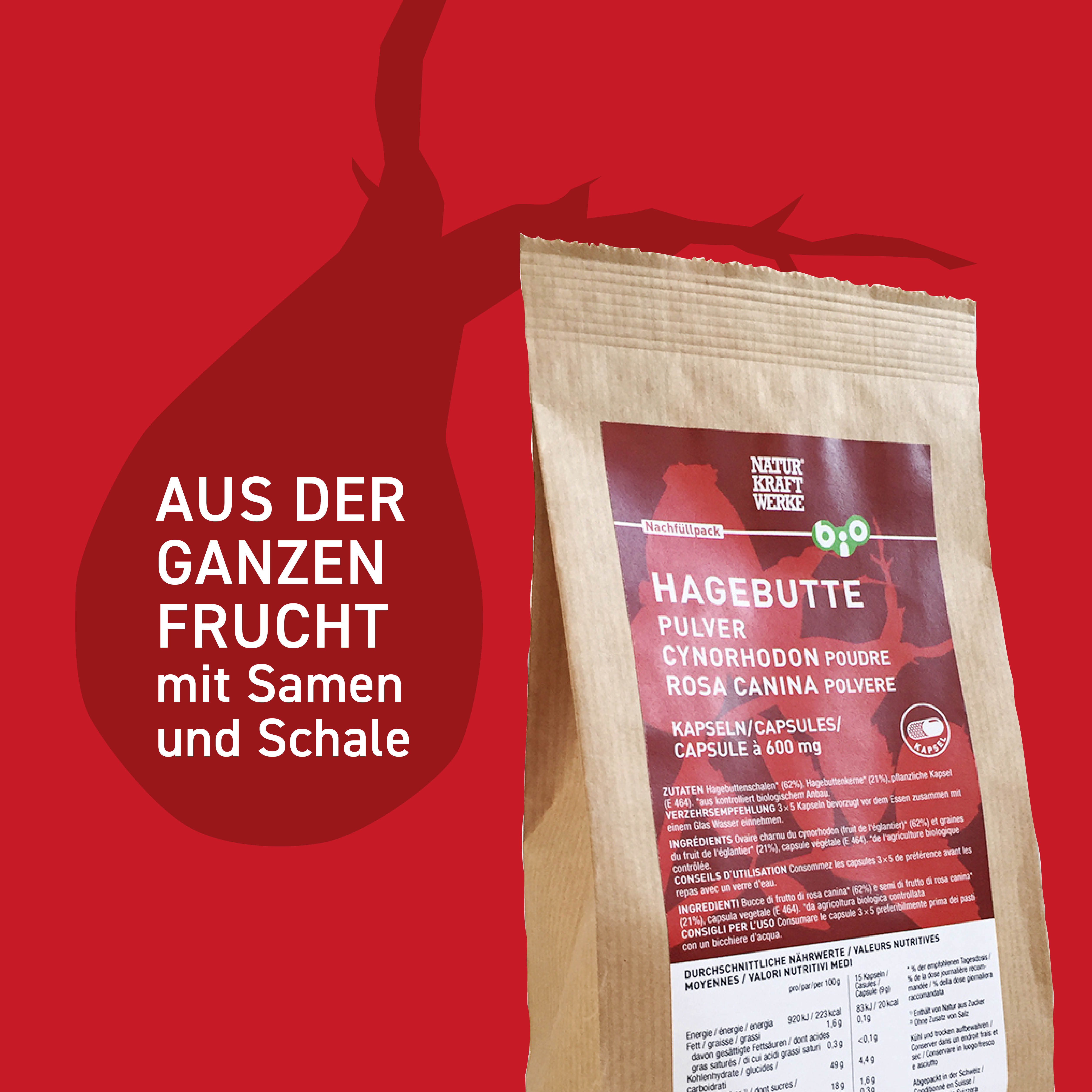 Seit vielen Jahren ist Hagebuttenpulver bekannt und beliebt. Verschiedenste Anwendungen sind beschrieben. Neben dem natürlichen Vitamin C enthält die Hagebuttenfrucht zahlreiche weitere Pflanzenstoffe, welche alle natürlich gebunden und unverändert in diesem reinen Fruchtpulver vorkommen. Ausserdem ist das Vitamin C in der Hagebutte aussergewöhnlich hitzestabil, weshalb es auch in deinen Porridge oder in den Kuchen, ins Brot, in die Suppe passt.