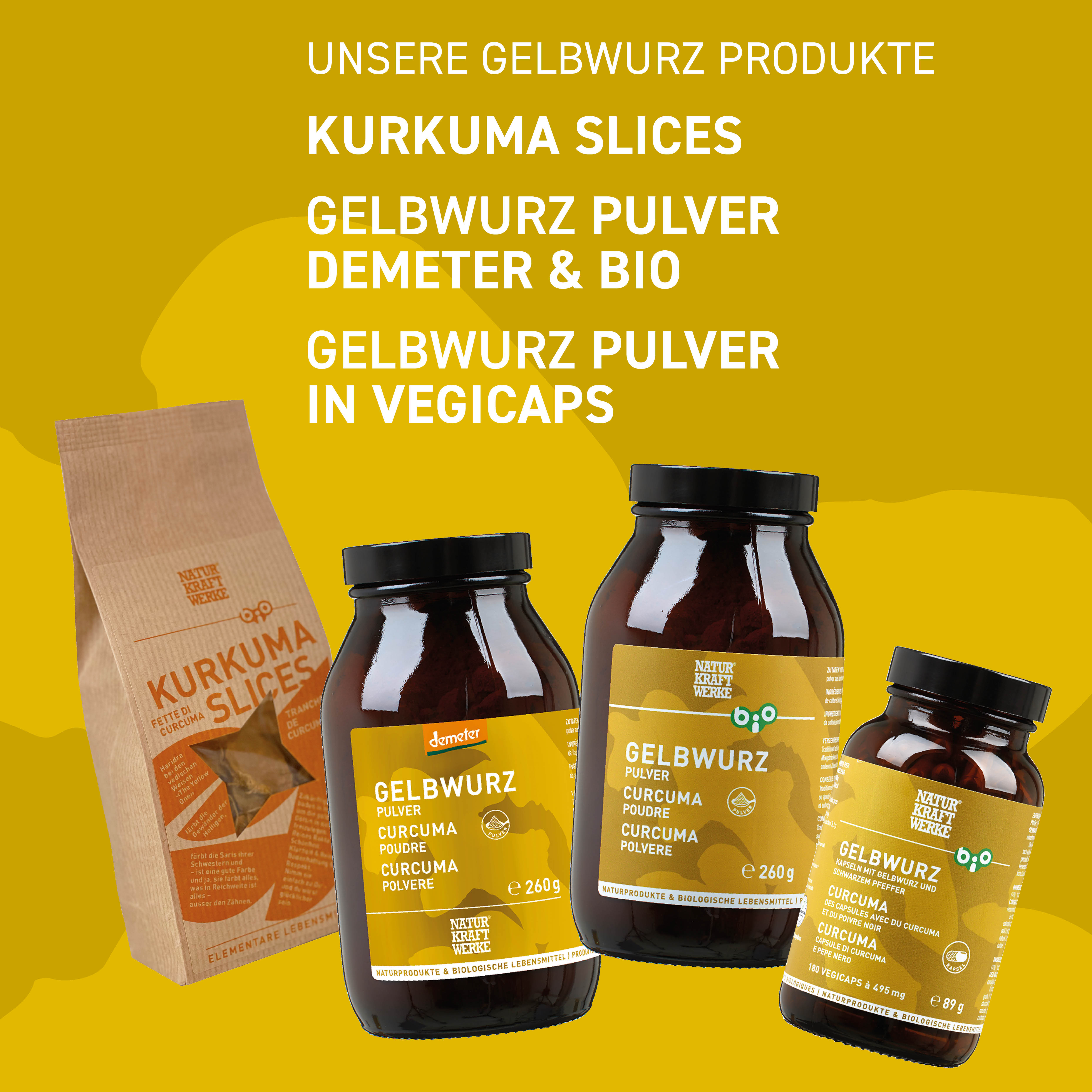 Gelbwurz stammt aus Süddostasien und wird dort vielfach kultiviert. Das Rhizom (Sprossachse) der Kurkuma ist intensiv gelb gefärbt und wird frisch und getrocknet als Gewürz und als natürlicher Farbstoff verwendet. Im Rhizom der Kurkuma ist das für die gelbe Färbung verantwortliche Curcumin enthalten. Curcumin gehört zu den Polyphenolen und ist ein sekundärer Pflanzenbestandteil von Curcuma. Die Auswahl einer speziellen Kurkuma-Plantage macht bei unseren Gelbwurzprodukten einen Kurkumingehalt von über 5% möglich.